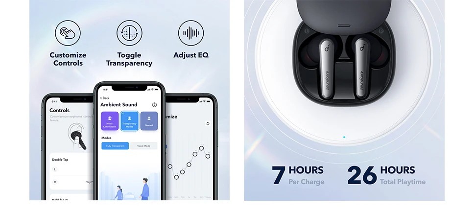Target ambient noises indoors, outdoors, and while traveling on the train, subway, or bus for a distraction-free listening experience. Switch between modes depending on where you’re listening via the soundcore app.