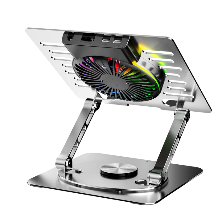 Equipped with a quiet yet powerful cooling fan, adjustable height angles, and a 360° rotating base, it ensures ergonomic comfort and flexible positioning. Powered via USB, it also includes dual USB ports and customizable RGB lighting, making it ideal for work, gaming, and everyday use with laptops and tablets.